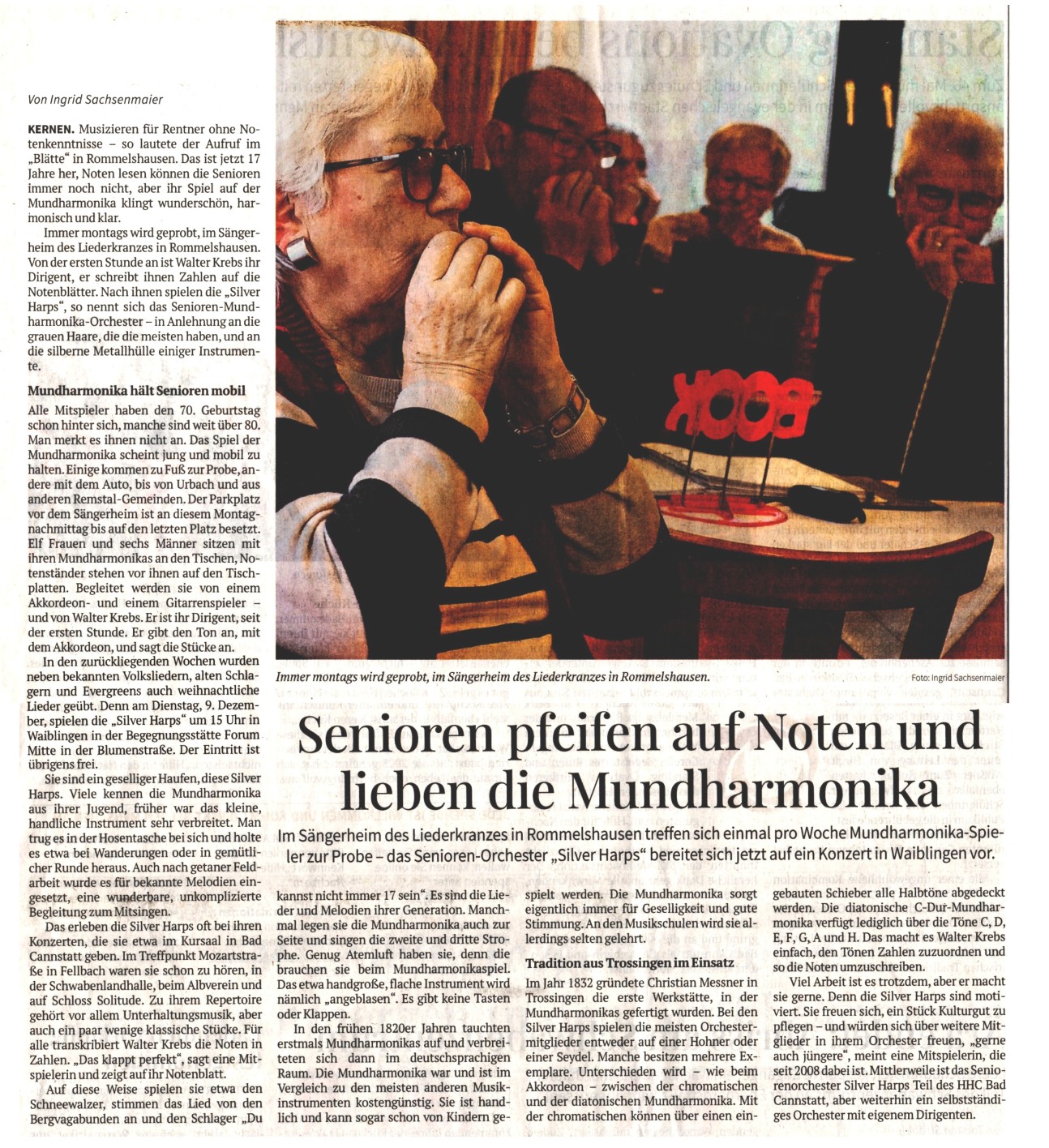 Mundharmonika für Senioren Für Senioren und Seniorinnen bieten wir spezielle Kurse an, wo dieses schöne Instrument, das zudem noch handlich und preiswert ist, erlernt werden kann. Nach Einübung der Grundkenntnisse können die damit erworbenen Fähigkeiten in unserem Mundharmonika-Orchester SILVER-HARPS" angewendet werden, um mit Gleichaltrigen in fröhlicher Runde gemeinsam zu musizieren. Die Kursleitung hat Walter Krebs, ausgebildeter Musiklehrer, selbst schon in fortgeschrittenem Alter, mit jahrzehntelanger Erfahrung in der Ausbildung und Leitung verschiedenster Instrumentalgruppen jeden Alters. Auskunft über Zeitpunkt, Ort, Gebühren usw. erhalten Sie unverbindlich bei Elisabeth Bode, 1. Vorsitzende, unter Tel. 0711 537 888.